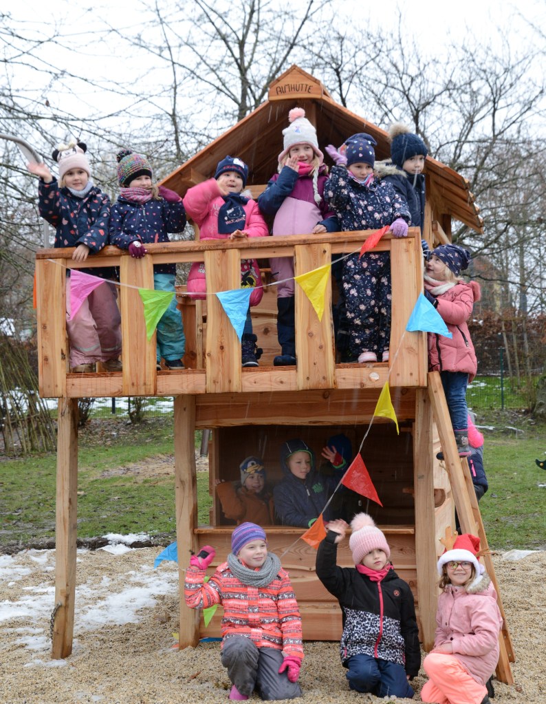 Endlich war es soweit: Am 8. Dezember 2022 konnten wir das neue Spielhaus einweihen. Die Kinder der Vorschulgruppe durften als erste das Stelzenhaus ausprobieren. Bei nasskaltem Schneeregen wurde der Verkaufsstand im Untergeschoss auch gleich als trockenes Plätzchen für den Verzehr von Leckereien vom anschließenden Weihnachtsmarkt im Kindergarten genutzt!